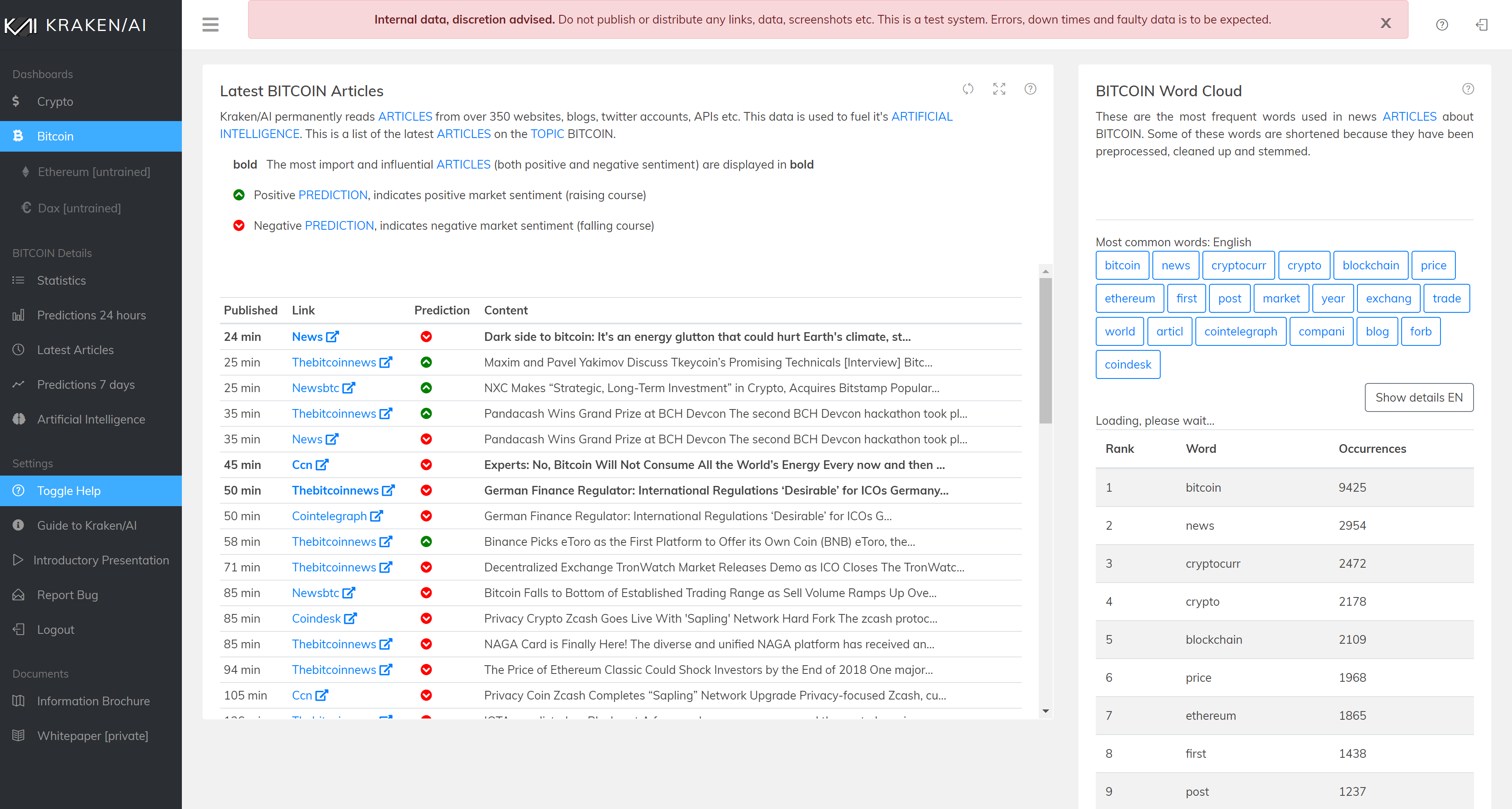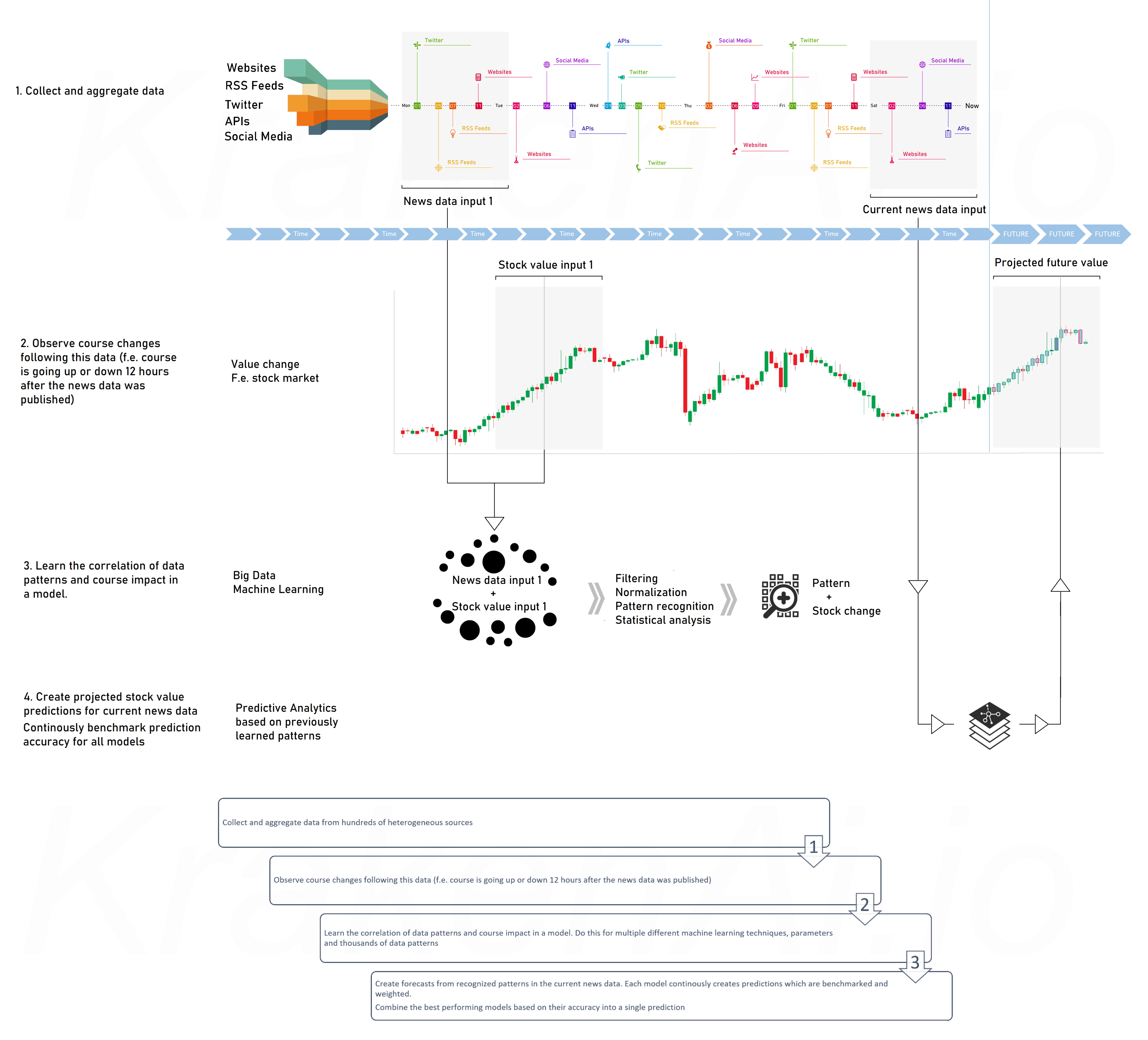 Kraken/AI reads hundreds of news articles, tweets, etc. in parallel and real time. It compares this data with occurrences and patterns which its machine learning algorithms have learned from historic data and predicts how the affected stock value will change in the near future.