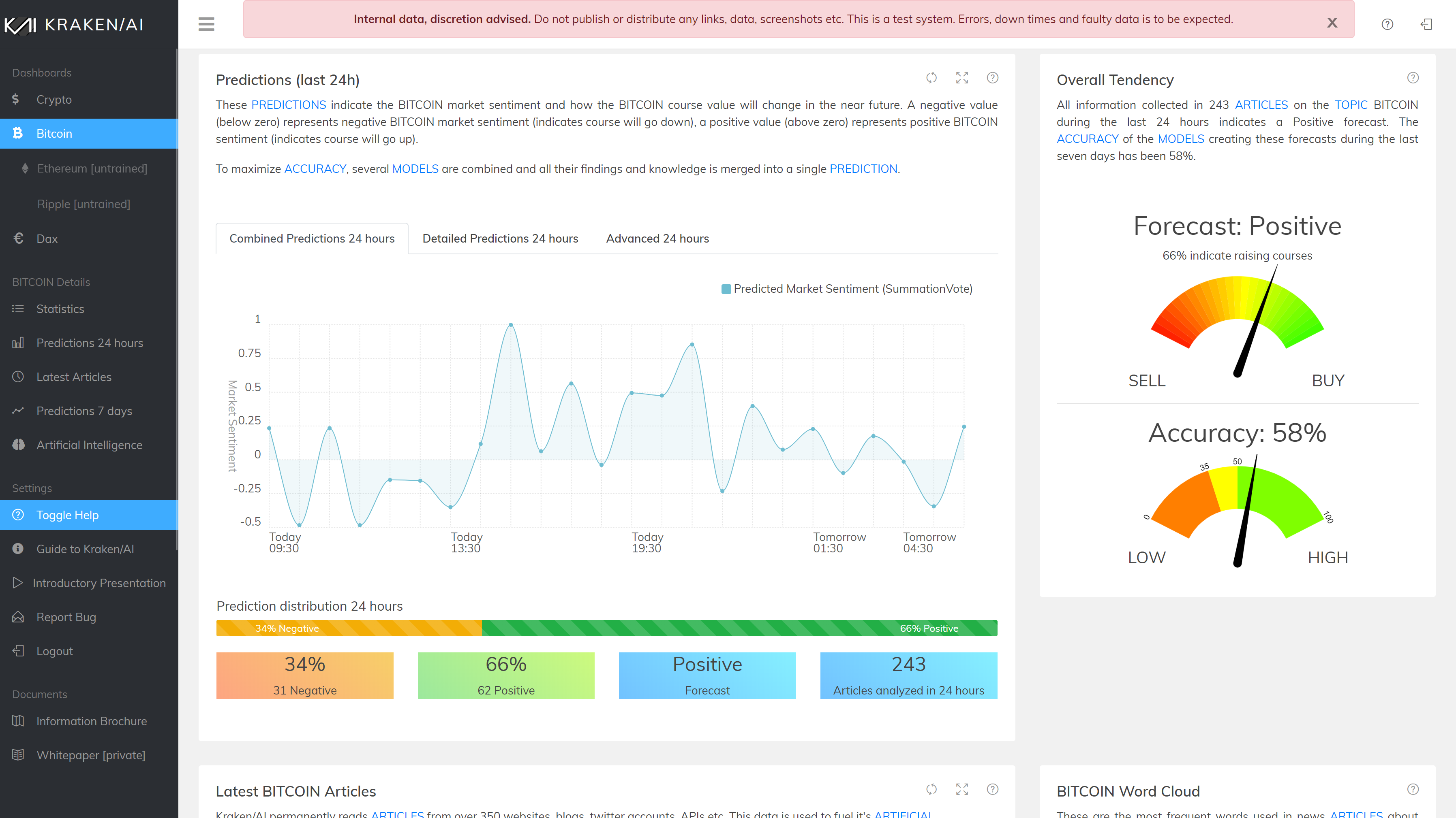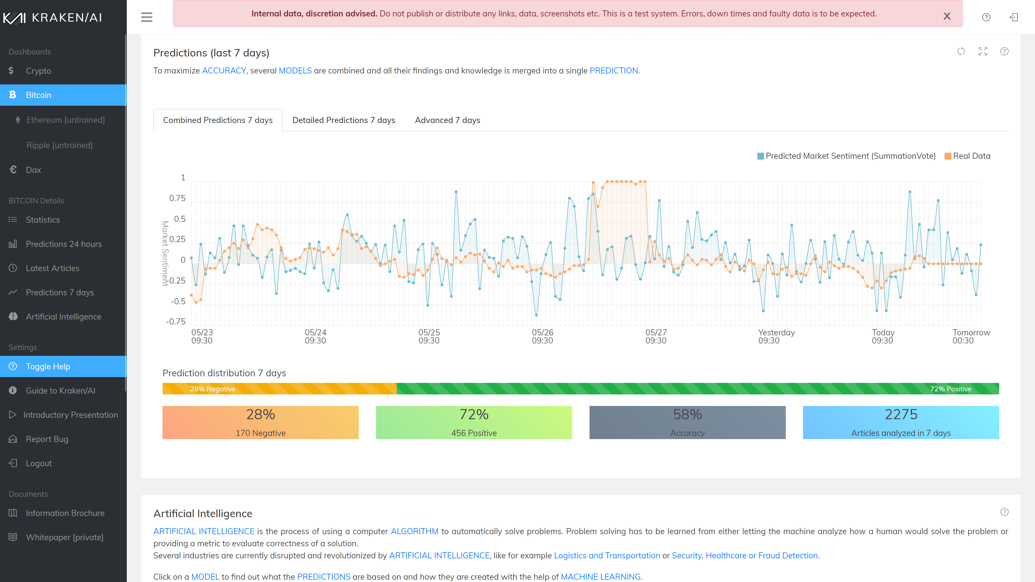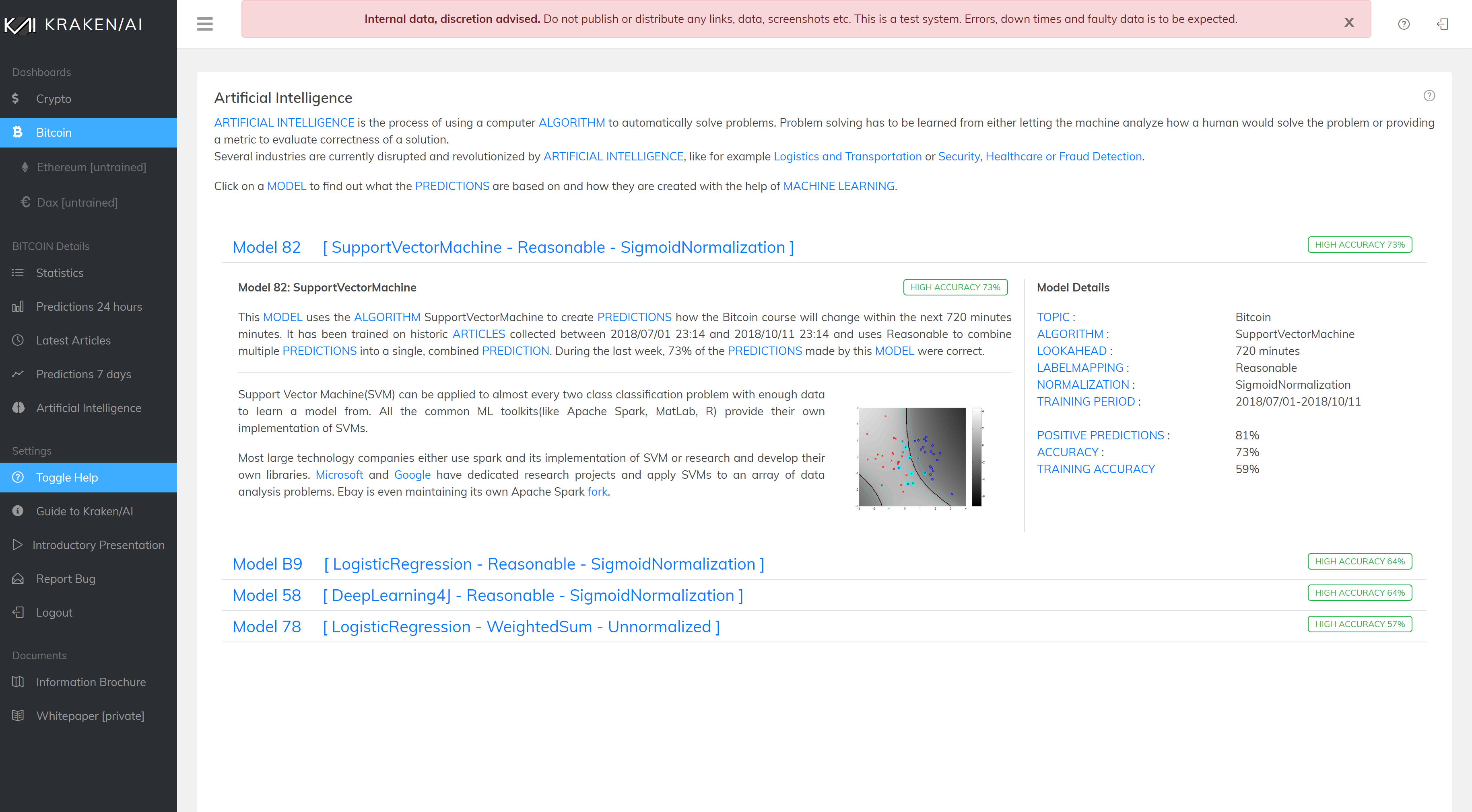 Kraken/AI uses a combination of data mining (Kraken) and machine learning techniques (AI) to analyze stock behavior. This is not to be confused with high frequency trading, simple sentiment analysis or trading bots.